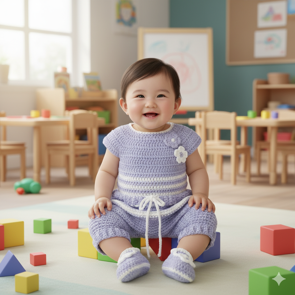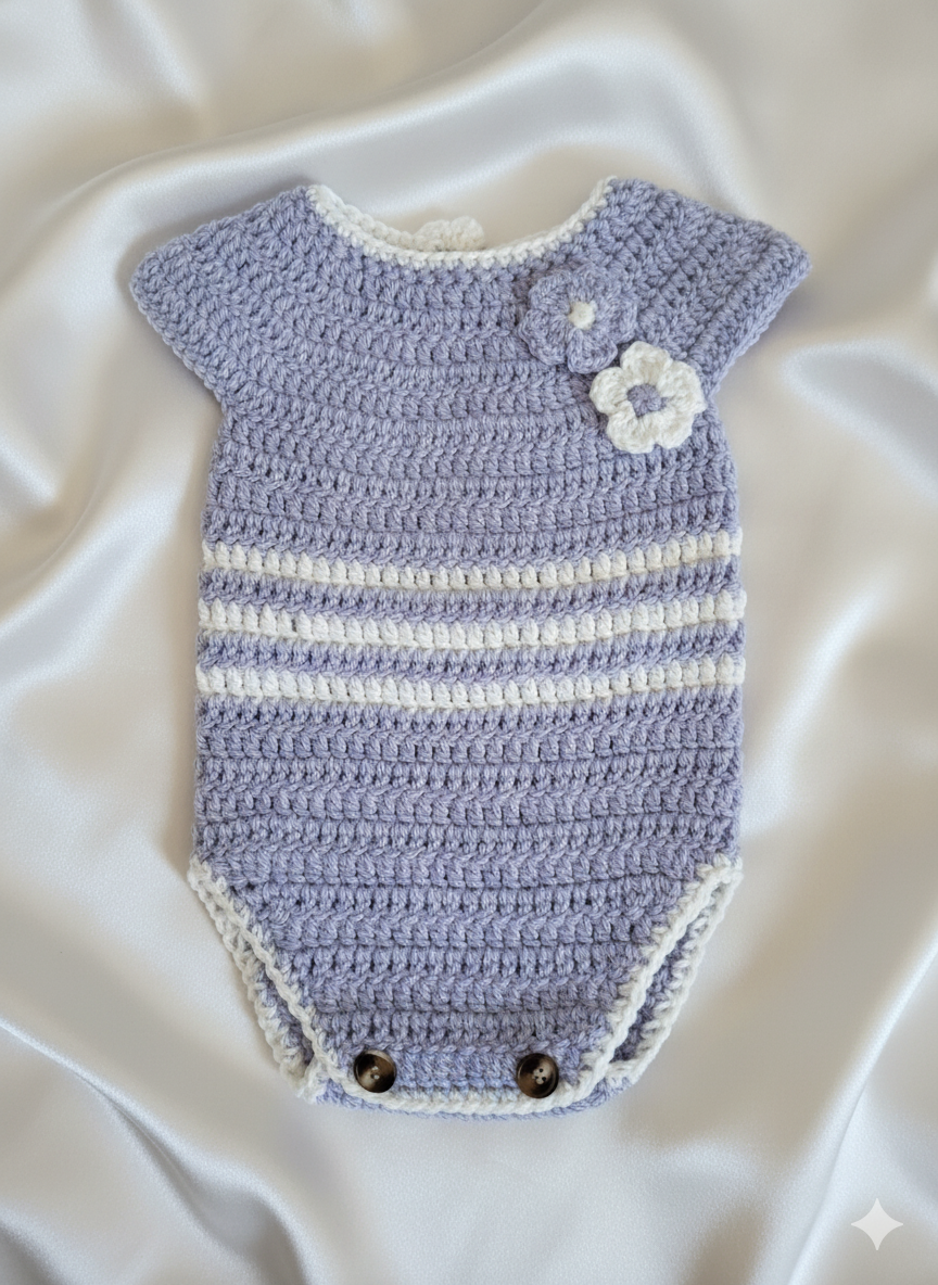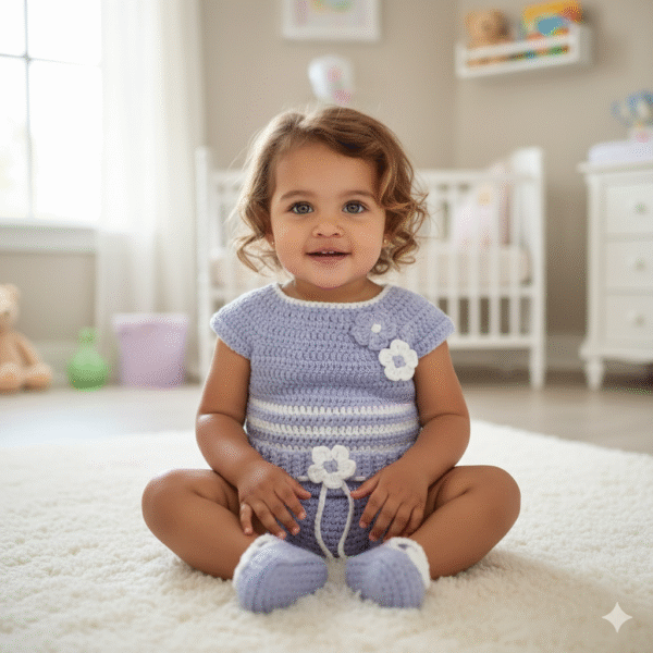 Soyez le premier à laisser votre avis sur “🌸 Ensemble Complet (3 Pièces) | Crochet Fait Main | Lavande & Blanc (1-3 Mois)”