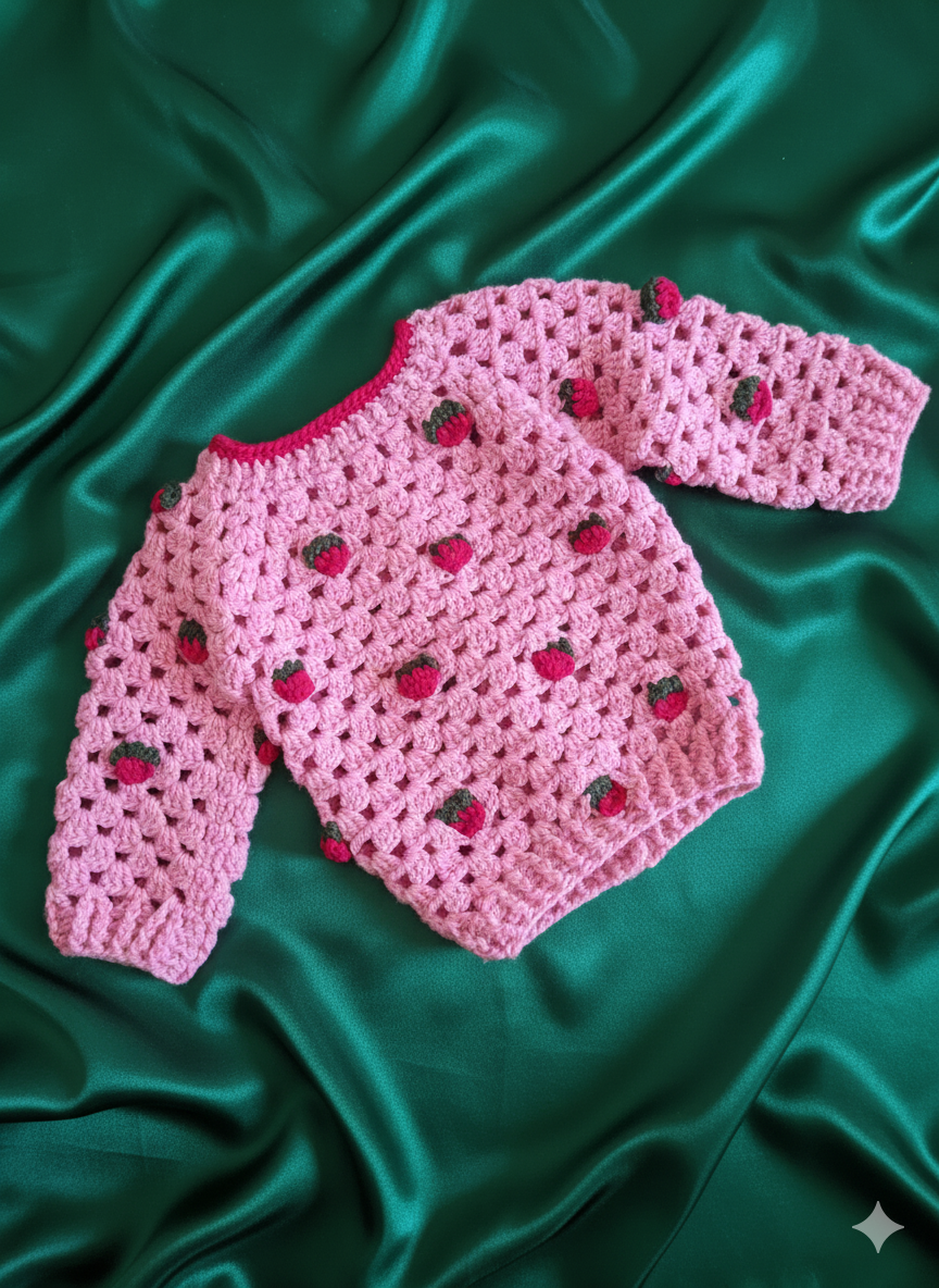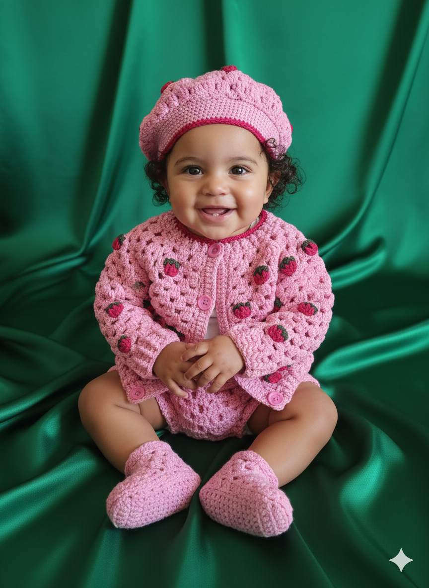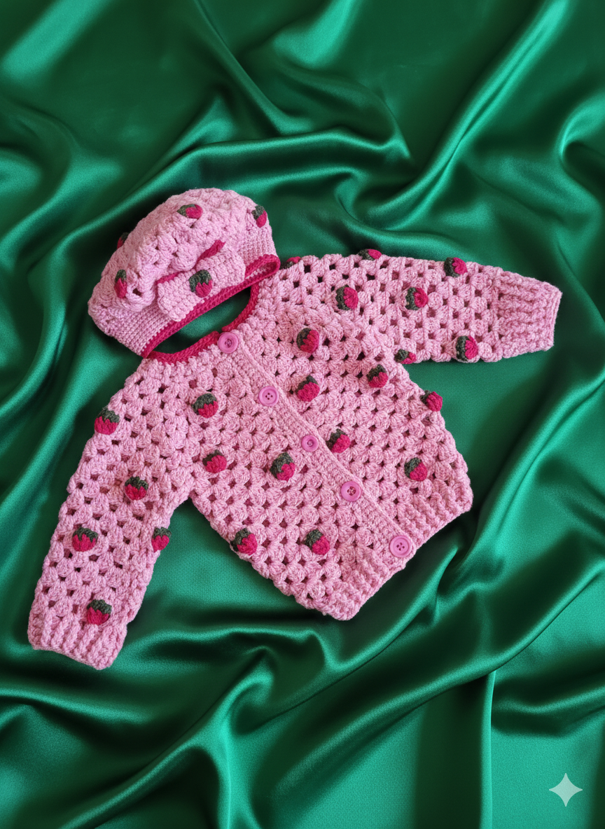 🍓 Ensemble Cardigan & Béret FILLE “Jardin de Fraises” au fait main Crochet (Rose Vif 3-6 Mois)