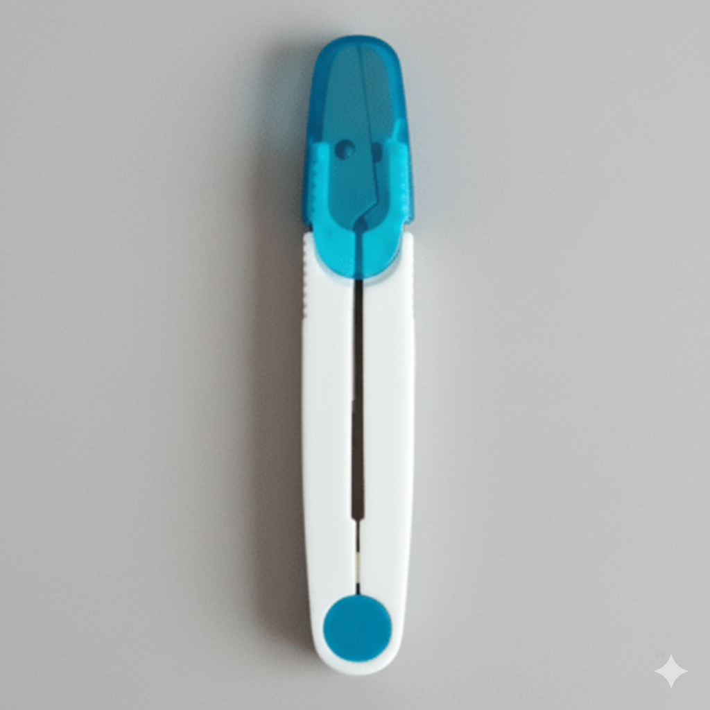 - Sécurité et portabilité : Son format compact et son capuchon de protection intégrale (ici en bleu) permettent de le transporter partout en toute sécurité (poche, pochette ou boîte à couture).