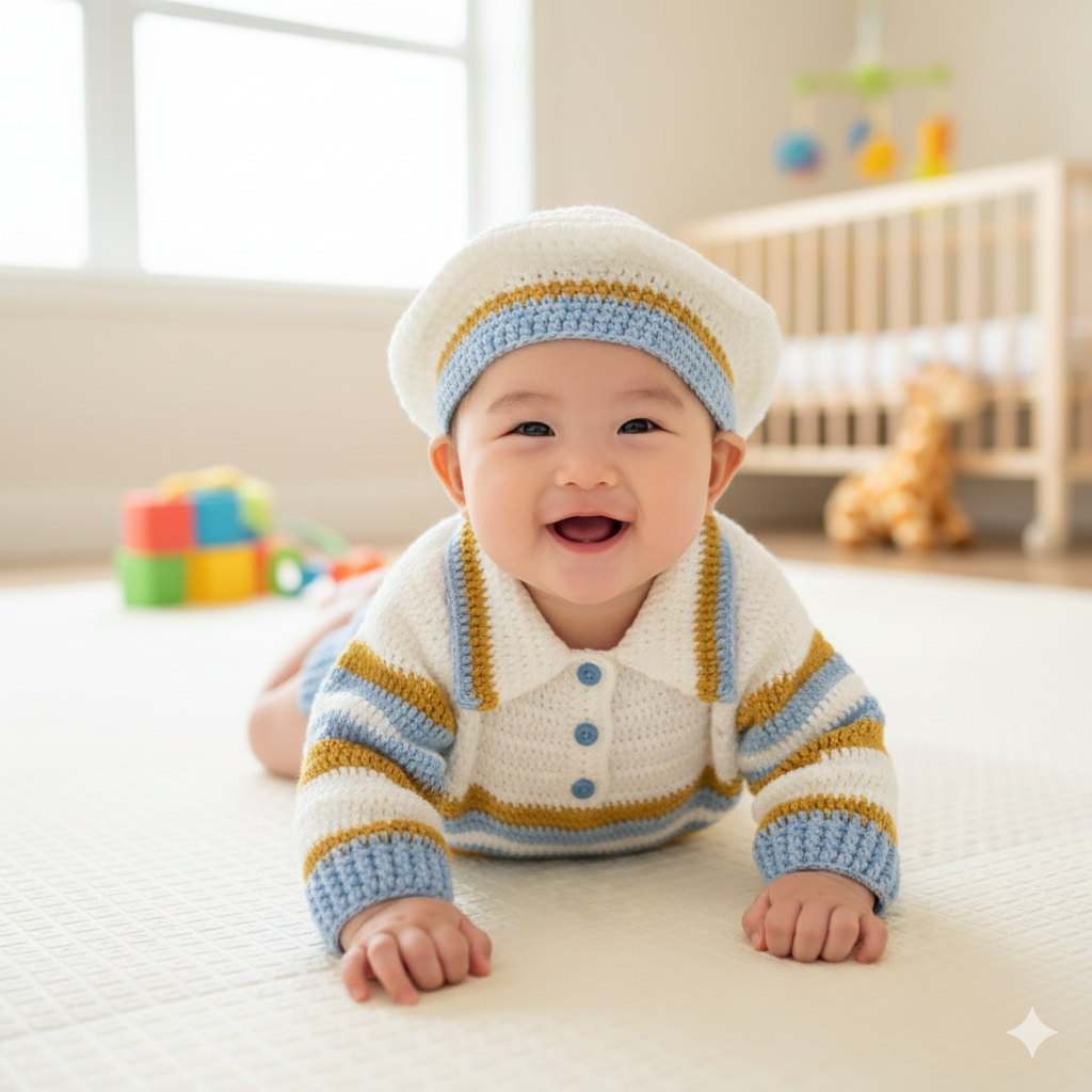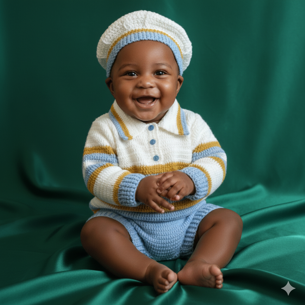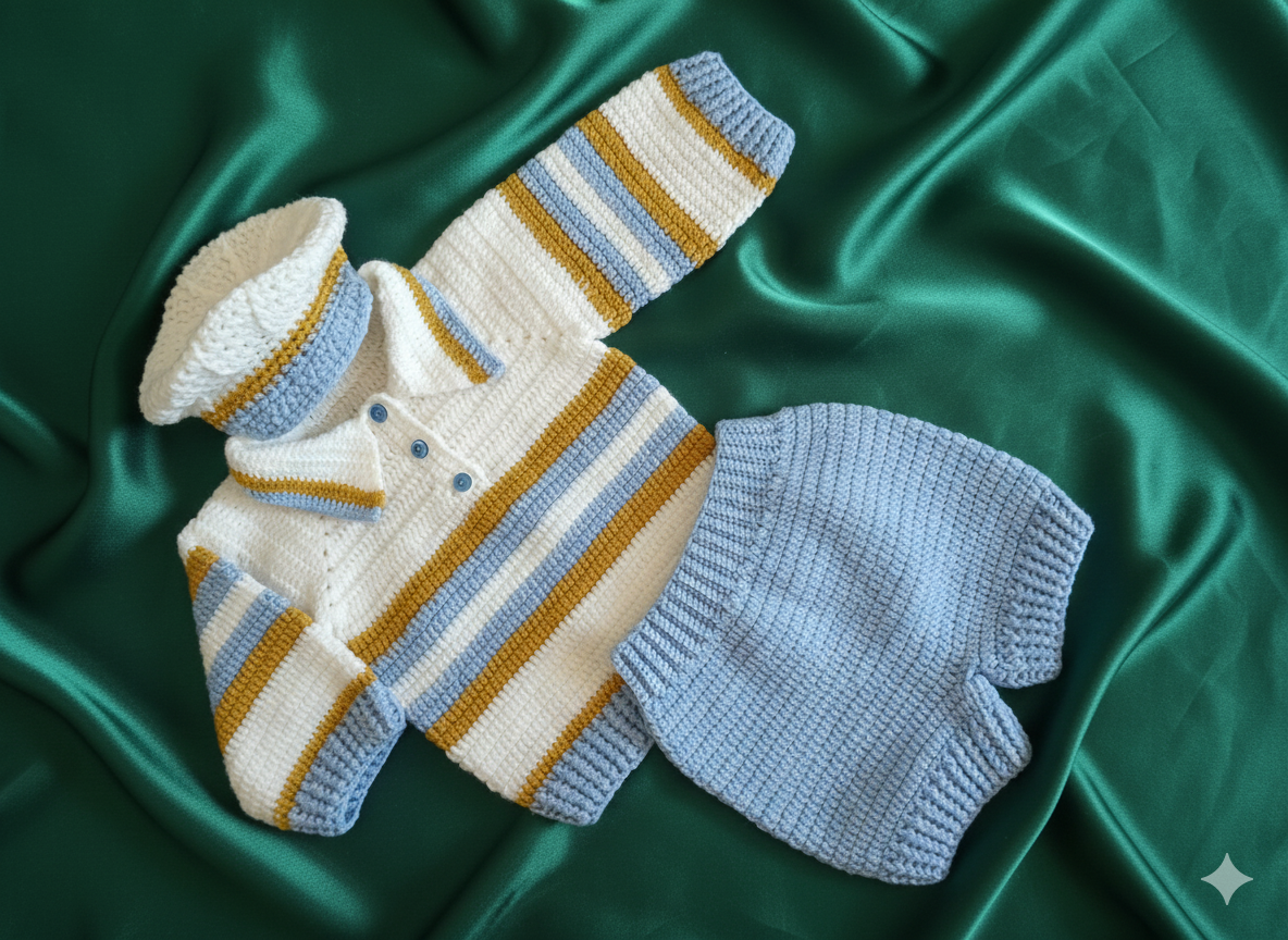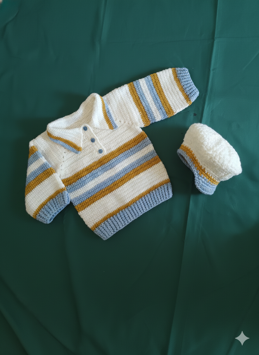 Cet ensemble de trois pièces est entièrement réalisé à la main au crochet, affichant un thème marin/marinière classique. Il est parfait pour un garçon, idéal pour les sorties estivales ou pour un thème nautique.