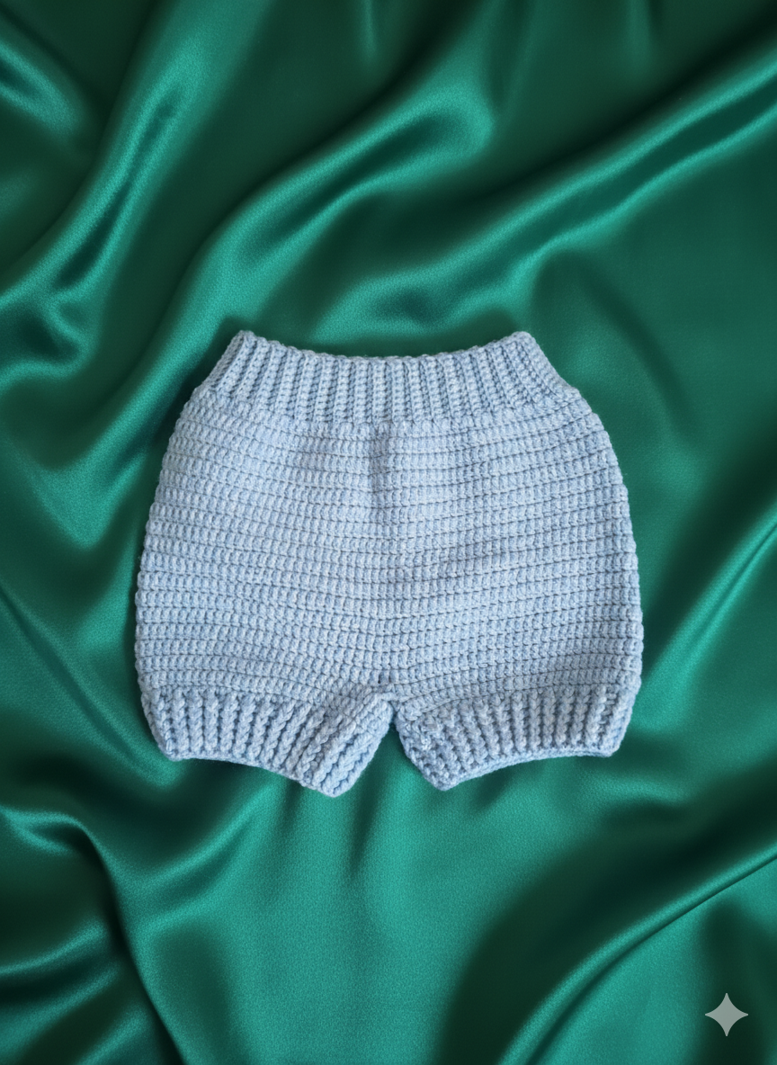 - Couleur et Finitions : Il est d’une couleur bleu ciel uni. Les jambes et la taille sont finies par un bord-côte au crochet, assurant un bon maintien et un effet bouffant.