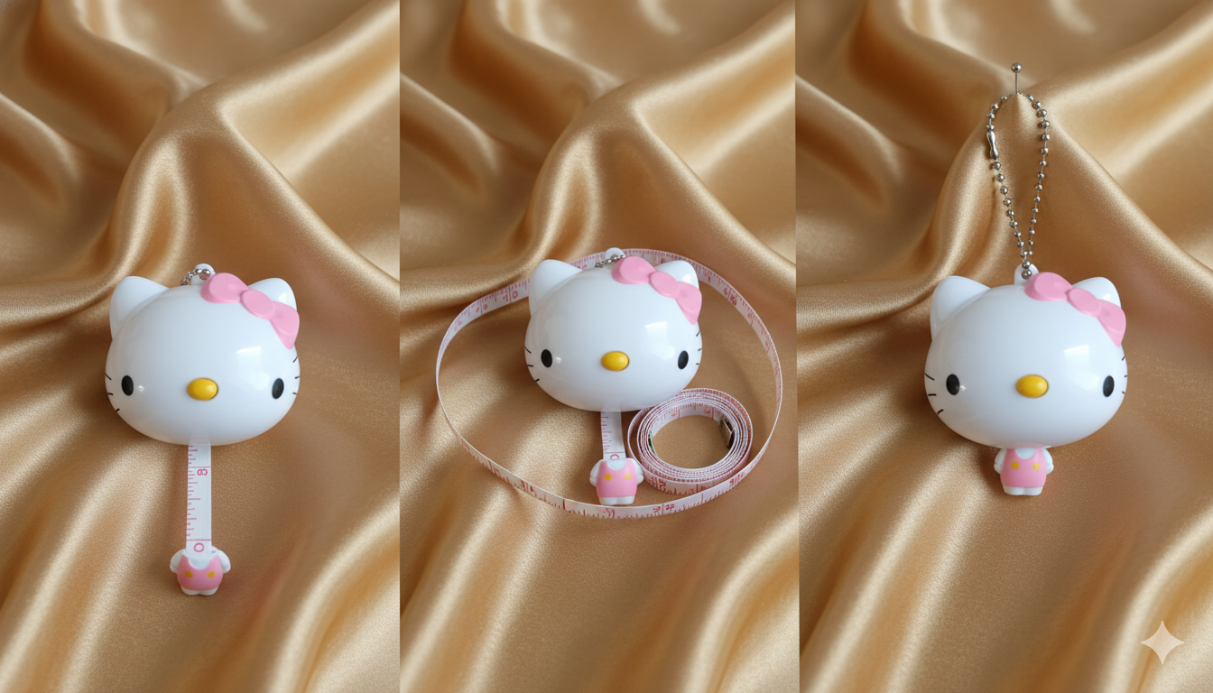 Ce charmant accessoire est bien plus qu’une simple breloque ! Il s’agit d’un mètre ruban rétractable 2-en-1 dissimulé dans un boîtier miniature à l’effigie d’Hello Kitty, parfait pour les passionnées de mercerie qui aiment la fantaisie.
