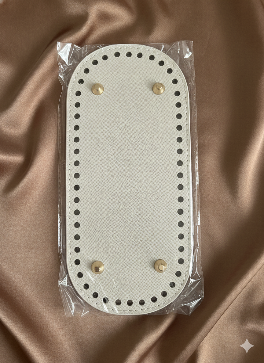 titre : fond de sac ovale ivoire 22x10 cm | base rigide similicuir avec pieds pour crochet diyFond de Sac Ovale 22×10 cm | Base Rigide Similicuir avec Pieds Ivoire